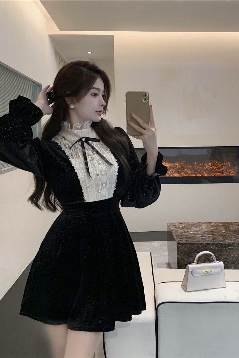 スタイルレースベルベットドレス オータムスタンダードウェストAラインスカート ロング レトロ 秋物 ステッチ フラワークラフター77037274640